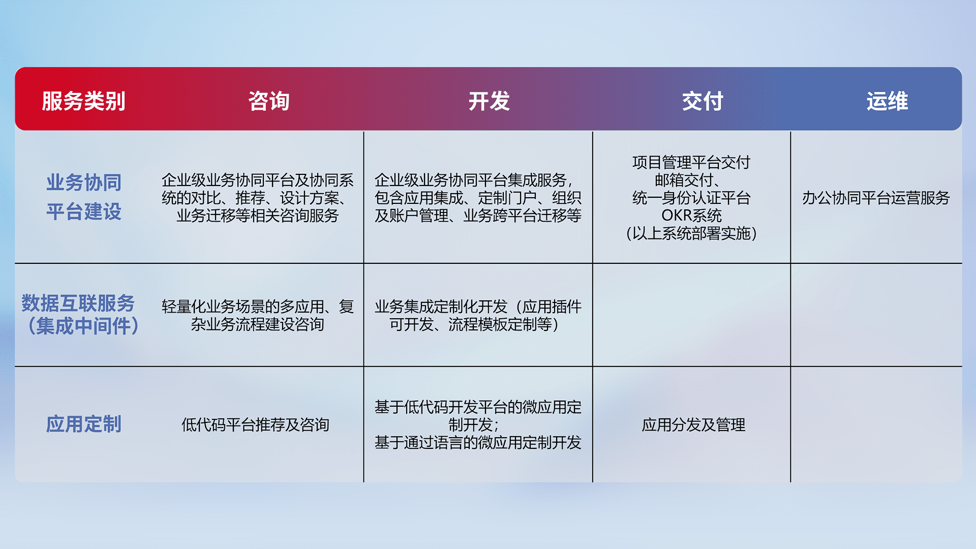 针对钉钉、、、、企微、、IDaas等平台级产品提供产品的规划、、、方案、、交付、、定制化开发等服务,,,,实现如统一协同办公、、、、智能客户服务、、、、混合会议管理、、智能数据查询、、等业务场景,,实现数字化转型。。。。